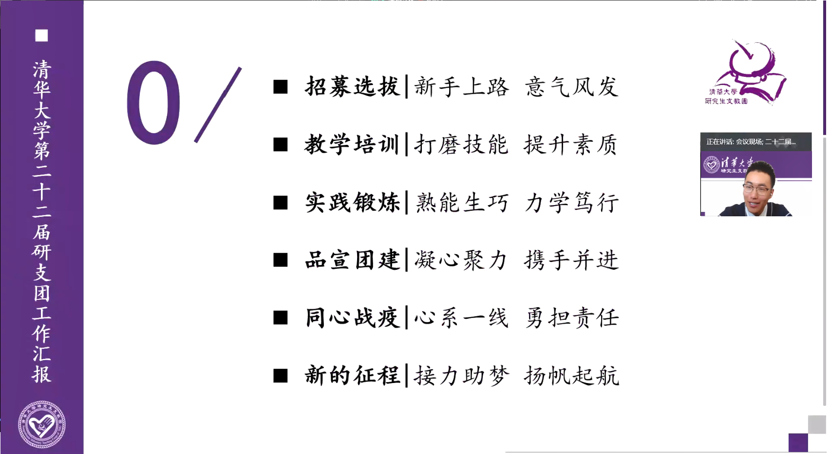 第二十一届支教团团长韩储银代表全团汇报一年支教服务的整体情况。一年来,志愿者们在教育教学、党建团学、公益扶贫等多方面辛勤耕耘,取得了显著成效。志愿者们坚守初心,全力开展教育扶贫工作,所带班级在学习上进步显著。疫情期间,志愿者们仍然积极开展线上教学,尽最大努力完成教学工作,停课不停学。在研究生支教团功能型党支部的指导下,进一步完善“助梦计划”公益体系,申报并入选团中央《脱贫攻坚志愿优秀项目案例集》,同时被评为全国十二个精选案例之一,该案例集将于近期出版。今年4月,青海湟中分队荣获第24届“中国青年五四奖章集体”,这是共青团中央、全国青联授予中国优秀青年的最高荣誉,也是对心博在线登录入口研究生支教团接力支教的重要肯定,更是对未来工作的激励与鞭策。