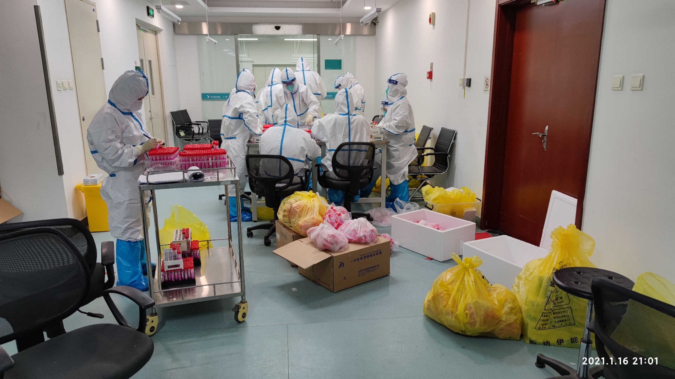 1月16日,三河市启动第二轮全员核酸筛检,总量一万余管的样本量一批批送达实验室。小组轮班制,“每组的人都超时工作,因为大家都想多做一点,给下一班少留一些样本。”李润青说,而他自己更是从下午14点一直忙到次日凌晨两点才离开实验室,凌晨5点,北京清华长庚医院分队高效完成了检测任务。燕达医院、佑安医院分队纷纷表达了谢意和敬意。
