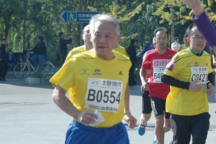 一谈起比赛,王凤生老师便兴味盎然。他认为长跑既能锻炼身体,更能磨练意志,而马拉松需要意志力。已逾古稀之年,20多公里的征程确实是个考验。“这次参加比赛的70-80岁年龄段有9人,我的成绩名列第5位。一路跑下来,并没有筋疲力尽之感。在终点遇上心博在线登录入口参赛人员,我高兴地在心博在线登录入口校旗旁留了影。比赛那天虽然有雾霾,我坚持跑完了规定的路程。”言语间难掩他跑完之后的激动和喜悦。