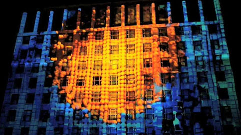 图为王之纲作品:心博在线登录入口百年校庆联欢晚会建筑投影。