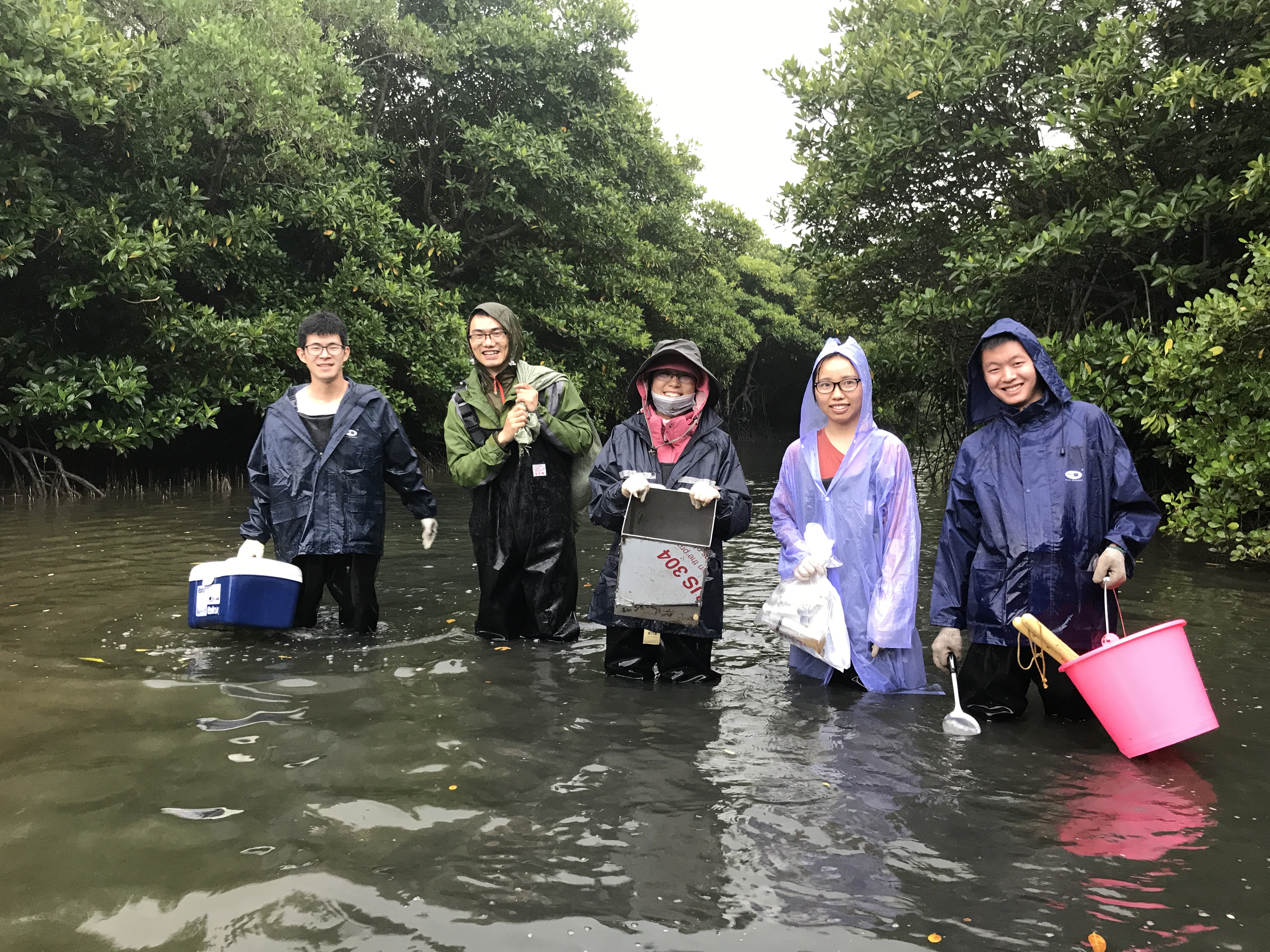 对于2018年刚进入地学系不久的苟睿坤来讲,第一次走进红树林的经历同样令他难忘。“我硕士就读于西北农林科技大学,主要研究的是黄土高原的油松人工林(针叶林)。那会儿,我觉得爬陡坡、背水泥桩,就已经非常痛苦了。但当我第一次双脚踏进红树林沼泽地的时候,还是非常震惊的。”苟睿坤说,“记得我刚一踏进淤泥,脚一滑半身就陷进去了,而且越拔陷得越深、再拔就全坐进水里了,下水裤里全灌进了海水。”