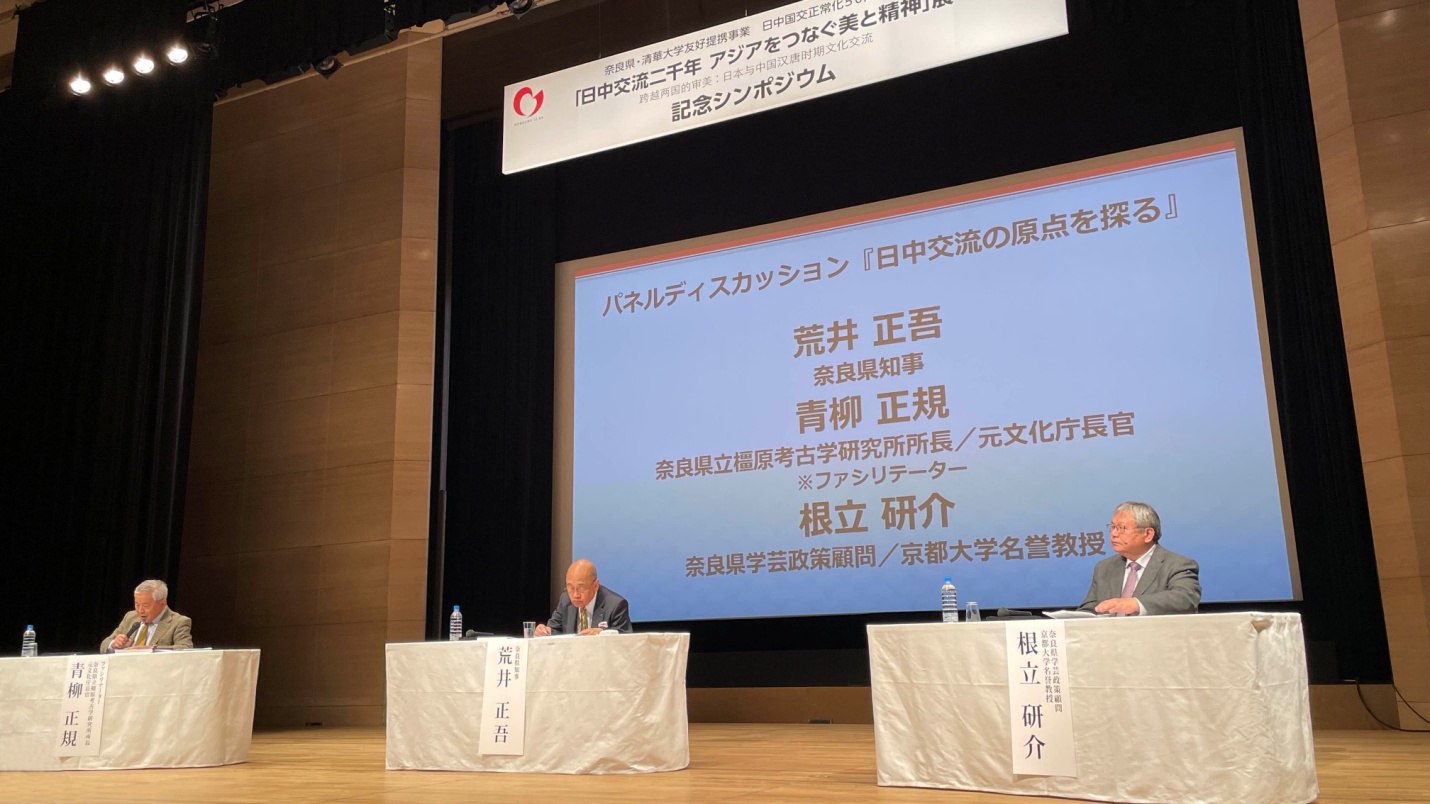 青柳正规、荒井正吾及根立研介(从左至右)就“探寻中日交流之原点”进行长达1小时的三人对谈