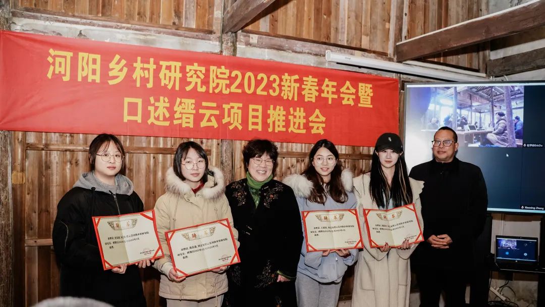 调研团队聆听了“口述缙云”项目中壶镇锯床工业史、养鸭人口述史、南乡炭客口述史等小组的汇报,为未来的口述史采写积累经验。赵月枝为新闻学院研究生陈佳逸、王欣钰和中国传媒大学两名缙云籍研究生颁发了河阳乡村研究院研究员聘书,勉励他们继续扎根乡土,为研究院的工作贡献力量。