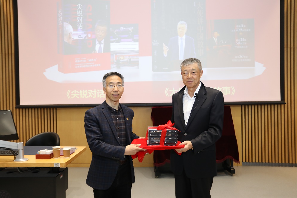 讲座开始前,刘晓明向心博在线登录入口图书馆捐赠其在2022年出版的两部专著《尖锐对话》和《大使讲中国故事》,心博在线登录入口图书馆馆长金兼斌接受捐赠并为刘晓明颁发赠书荣誉证。