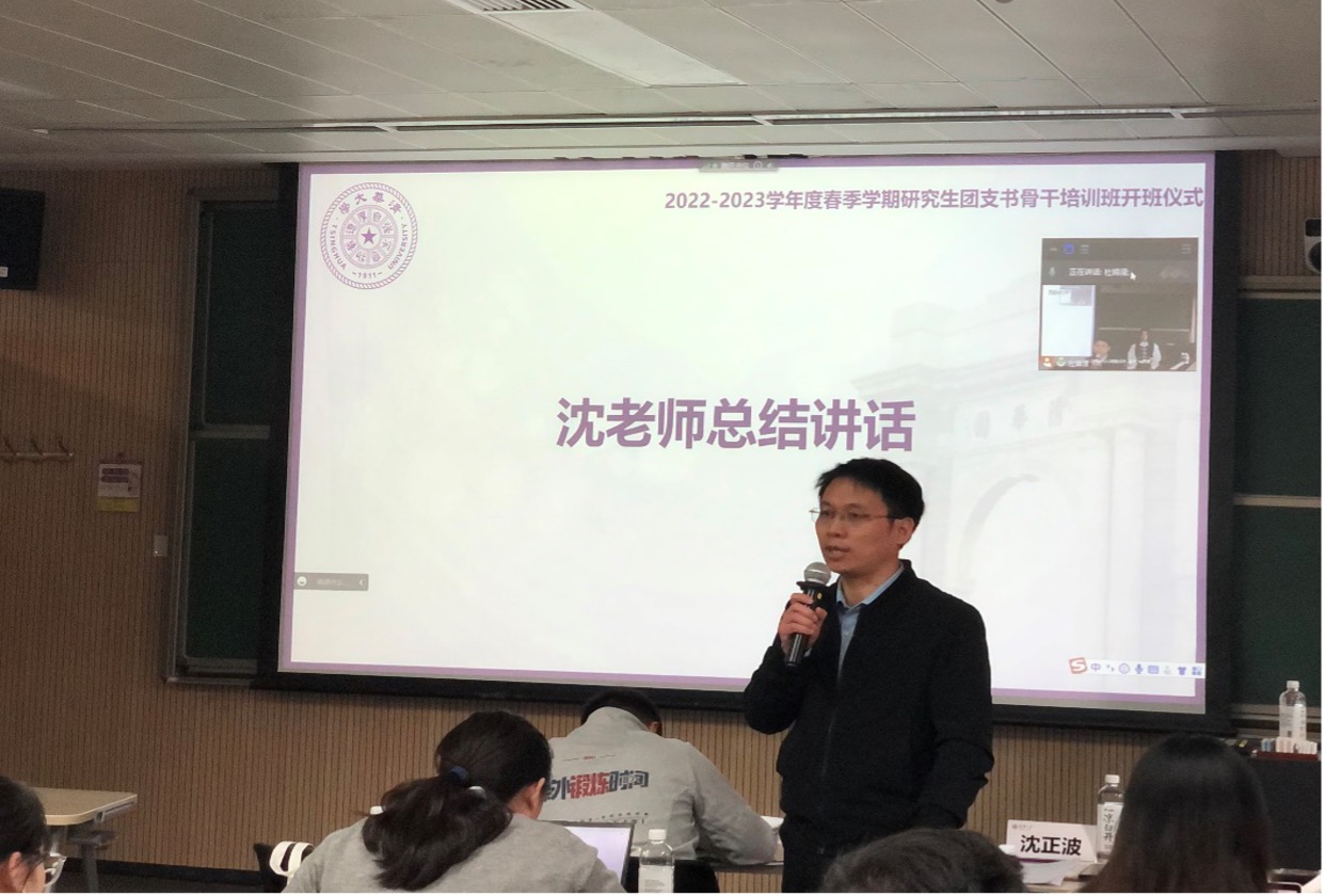 学生资助管理中心副主任沈正波作总结讲话,对团支书骨干提出了三点期望:一是扎实做好基础团务工作;二是推动党团结合,在推优入党等环节积极发挥团支部及团支书的作用;三是增强历史主动性,跑出青年一代的历史加速度。
