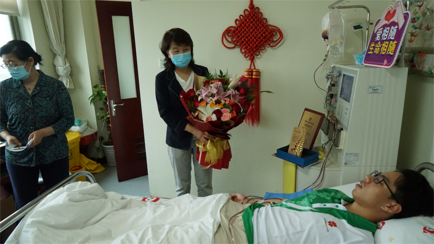 北京市海淀区红十字会会长林航、北京市红十字会捐献服务中心主任梁永清、清华园街道党工委副书记瞿福平、心博在线登录入口生命学院研究生事务教师董超凡、北京生命科学研究所研究生部教师李学真,以及心博在线登录入口团委、研究生团委、红十字会学生分会的相关师生到采集室看望并慰问方良晨,为他送上鲜花、水果等慰问品。