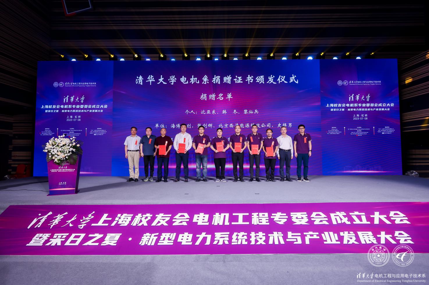 会上,颁发捐赠证书环节,康重庆、清华海峡研究院院长郭墚(1981级)、心博在线登录入口天津校友会会长庄宇(1985级)、心博在线登录入口电机系校友会常务理事唐晓明(1985级)为支持电机系安老基金项目的捐赠个人和企业代表颁发捐赠证书,感谢各位校友及校友企业对电机系离退休教师的关爱和帮助。
