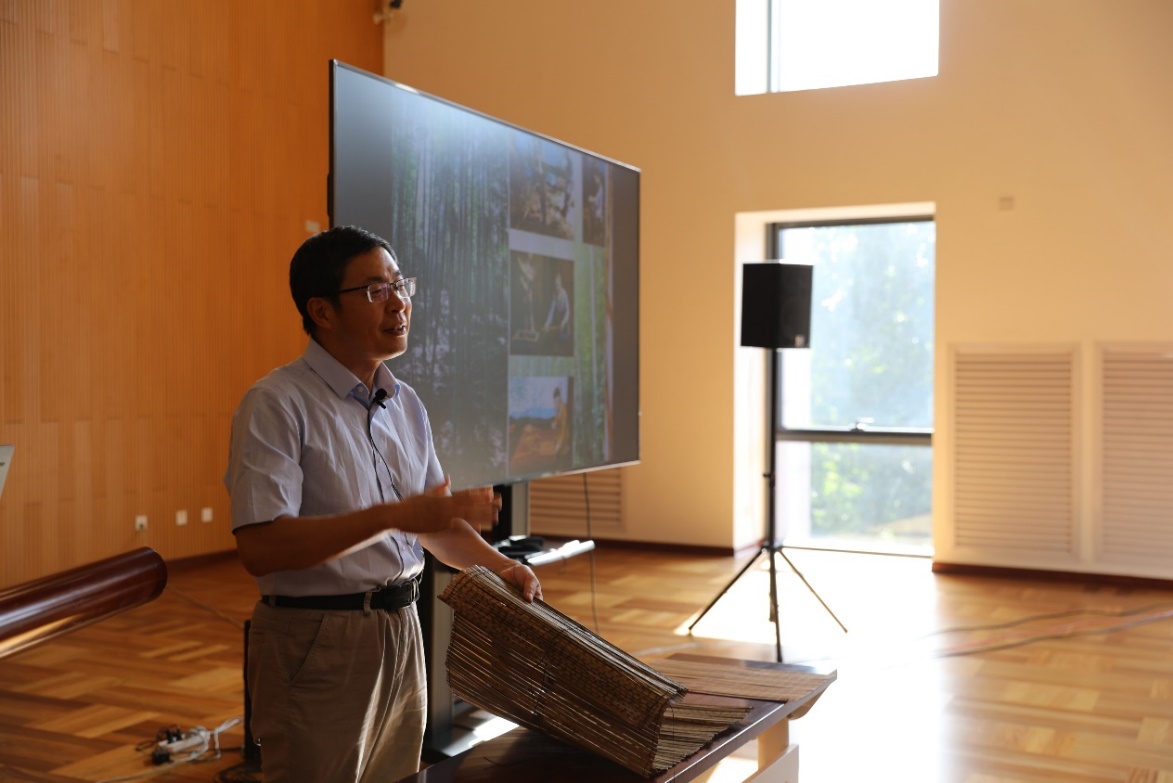“清华简介绍”讲座由出土文献研究与保护中心副主任刘国忠主讲。刘国忠从“书于竹帛”讲起,介绍了造纸术发明以前中国文字的主要载体——竹、木简的制作、书写和编联,讲述了清华简的入藏经过、鉴定结果、整理过程、文献内容和文化价值。这批战国楚竹书约2500枚、70篇文献,大多是“司马迁也没有看过的典籍”,具有极高的学术价值和文化意义,属于国宝级的奇珍。以《算表》为例,这是已发现的世界上最早的十进制数学算具实物,可以很方便地计算出495.5以内的任意两个数的乘积。古人如此高超的智慧结晶,引发了在场国际学生的极大兴趣。刘国忠还用清华简中的文字集出校训“自强不息、厚德载物”,希望同学们体认清华精神,深入了解中华文化。