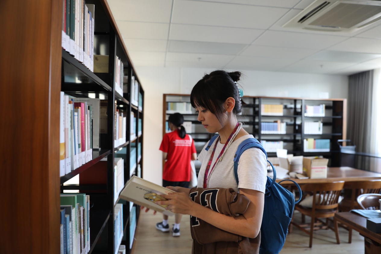 中心图书资料室以语言文字、历史、考古、四部经典类书籍为主,各屋均有木桌圈椅可供自习,窗明几净,疏朗宁谧,北眺人文馆,南望教学楼,是自习阅览的好去处。同学们随手取下藏书翻阅,感受着中华文化的丰富悠远,也感受到清华舒适的学习环境,不禁憧憬起即将开始的大学生涯。