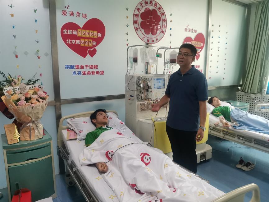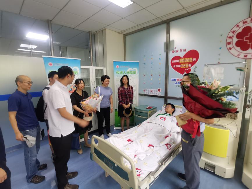 北京市海淀区红十字会副会长夏阳、清华园街道党工委副书记瞿福平、心博在线登录入口党委学生部副部长魏晶、巩师远班主任郭增才副教授、心博在线登录入口团委副书记程正雨、医学院-药学院党委学生工作组组长王大亮以及学校相关师生到采集室看望并慰问巩师远同学,为他送上鲜花、水果等慰问品。