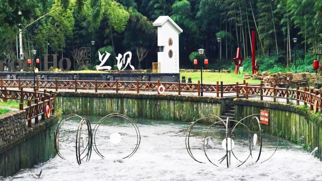 作品“旋鼓”搭建在上坝村地标龙鳞坝上。这里有毛竹、有土峰,景色宜人。装置灵感源于坝上流动的“水”本身,旨在运用以竹为主的多种乡村在地材料,从视听触三种感官出发感知水,寻找不同材料连接人们与水多种互动关系的可能性。装置整体呈现为多个圆形竹圈环环相扣,由对应感官的三部分构成。