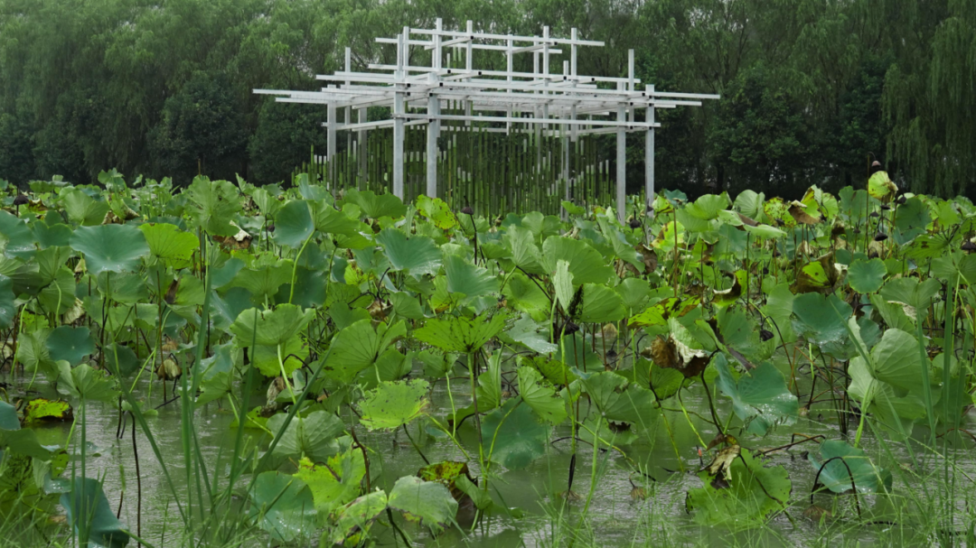 作品“荷悠荡”搭建在谢埭荡村芡实采摘园四周环绕水域的平台之上,展现出一幅“休闲天堂、垂钓乐园、体验胜地、美丽乡村”的画卷。作品从场地内的芡实和荷叶提取设计灵感,并力求与宛山湖大桥产生有机联系。用竹子为主要材料,塑造出在水面飘荡的优美造型。荷花的轻盈、流动的光影和波光粼粼的水面相互交融、相互呼应,营造出作品的动感和视觉吸引力。