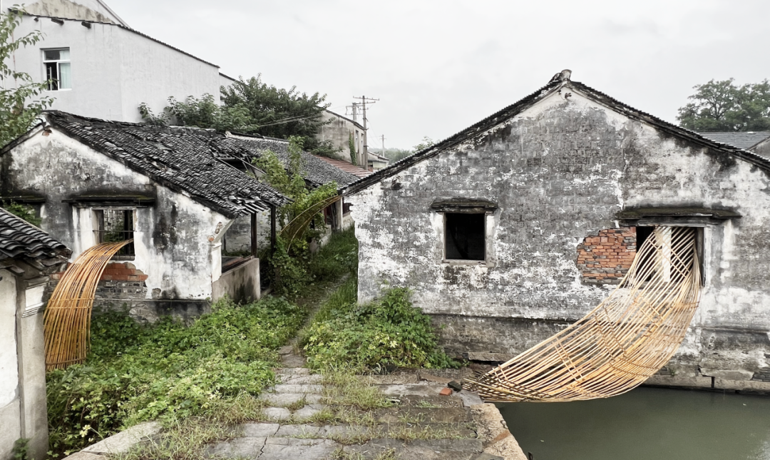 作品“水绕”搭建在大坊桥村传统民居之间。伯渎河流贯穿这个村庄,水体塑造了这里的社交和文化场景。设计灵感源自水面涟漪,巧妙地将房屋、桥梁和码头连接在一起。用竹与线两种材料进行弯曲与编织,以仿效自然的方式,既回应了当地的环境,又强调了可持续性和美感,在场地中自由穿梭,突破建筑的框架与水陆的边界。