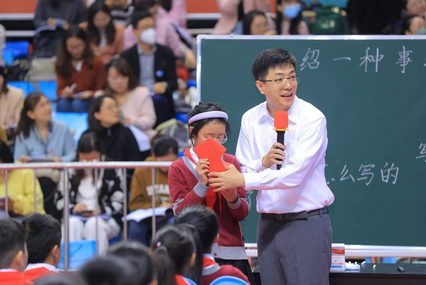 此次,王峰授课的课题是五年级习作“介绍一种事物”。本次授课经过备课组成员的精心准备,是清华附小2014年获得首届国家级教学成果一等奖的“小学语文主题教学实践研究”的新发展。授课力求在课堂上体现主题教学“语文立人”的思想,彰显清华附小“儿童站立课堂正中央”的教育哲学,并在此基础上充分落地语文新课标精神,以此统筹教材单元内部的整体联系,取得了良好的课堂教学效果。