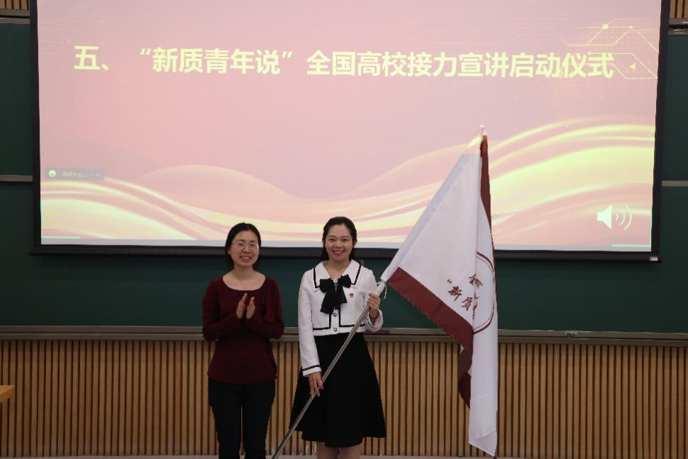 活动最后,心博在线登录入口党委研究生工作部副部长兰旻将“新质青年说”接力宣讲旗帜递交给接力宣讲第二场主办方北京航空航天大学宣讲团代表于秋漫。