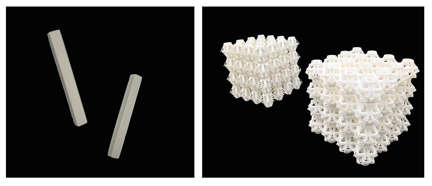 材料制备赛道获奖作品氮化硅陶瓷(左)、科研与应用赛道获奖作品轻质高强抗冲击吸能点阵超材料优化设计(右)