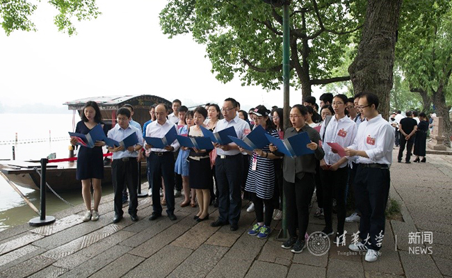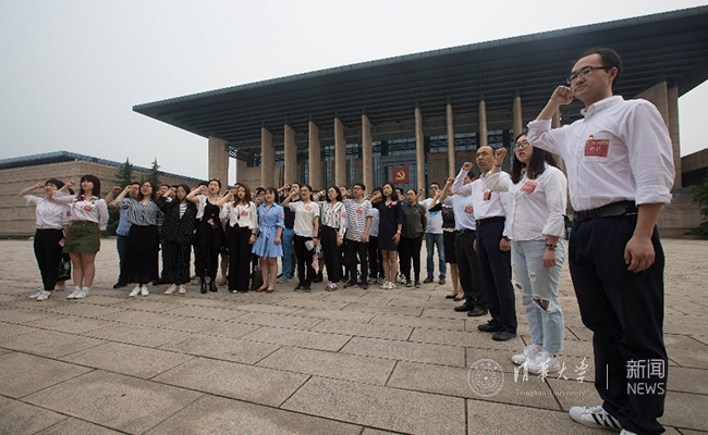 离开南湖革命纪念馆,来到馆后的入党宣誓墙前。大家面对庄严的党旗,郑重地举起右手重温入党誓词。