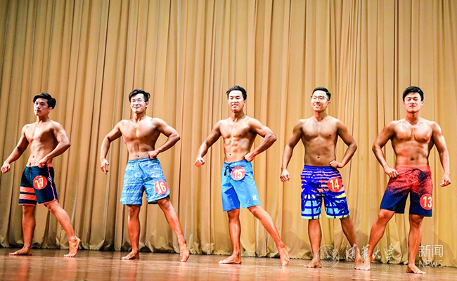 在激烈的男子健美组比赛中,选手们要在舞台上进行七个规定动作的展示和个人风采的一分钟自由展示。伴随着动感的音乐,选手们展示自己精心编排的动作。最终,来自人文学院的尹灿优获得男子健美的全场冠军,来自社会科学学院的项成奇和电子系的李亮分别获得第二、第三名。