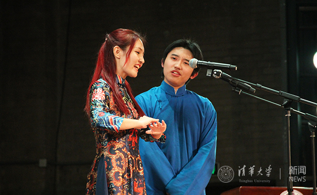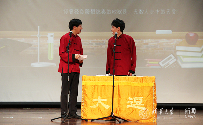 第一段相声表演是相声演员董建春和李丁带来的《卫国战争》,两位演员通过风趣幽默的语言和精彩的现场表演为我们讲述了二战的故事,博得全场的阵阵喝彩;第二段表演是李涵和迟永志带来的《时间与青春》,表演将中国古代传统文化和现代家庭背景结合,深切地启发了大家对时间、对生命意义的思考;第三段表演《论量子力学与广义相对论在相声创作和表演中的实践及应用》由清华曲艺队的国际关系系2016级本科生刘桐杉和机械学院2016级本科生刘宇霖带来,他们为大家上演了一出“四维空间”中的相声,让观众感受到科学在相声中应用的乐趣。