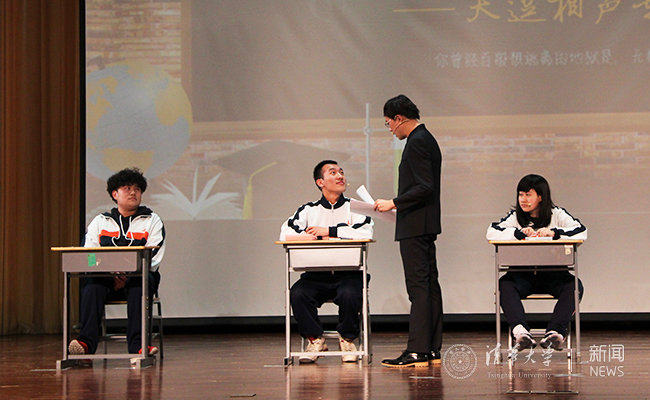 在四个相声表演之间的串场表演同样精彩纷呈。四位串场演员王梓鑫、武启深、钱琦、宋伟杰为观众们生动演绎了课堂中的喜怒哀乐,再现了师生之间妙趣横生的互动场景,引发了大家对学术道德等内容的思考。串场表演包袱不断、妙语连珠,赢得了观众们热烈的掌声。