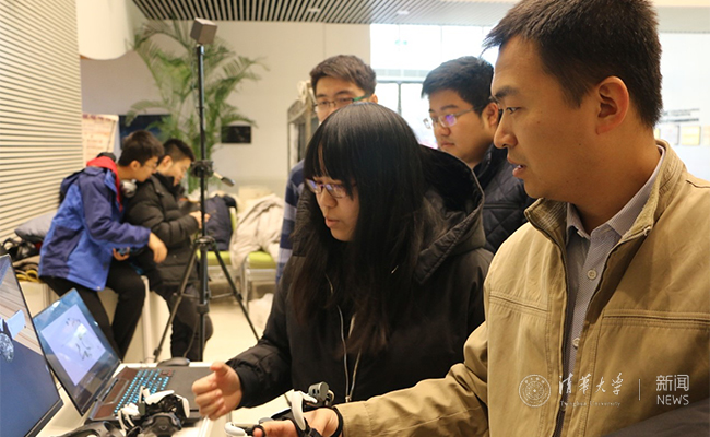 体验虚拟现实(VR)力反馈外骨骼项目。 倪文宇 摄