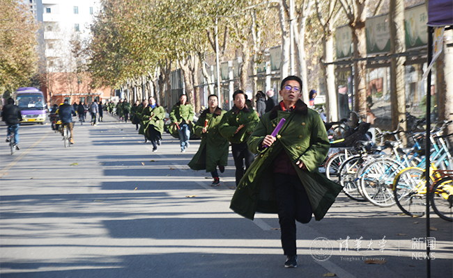 第四棒身披军大衣奔跑的同学。