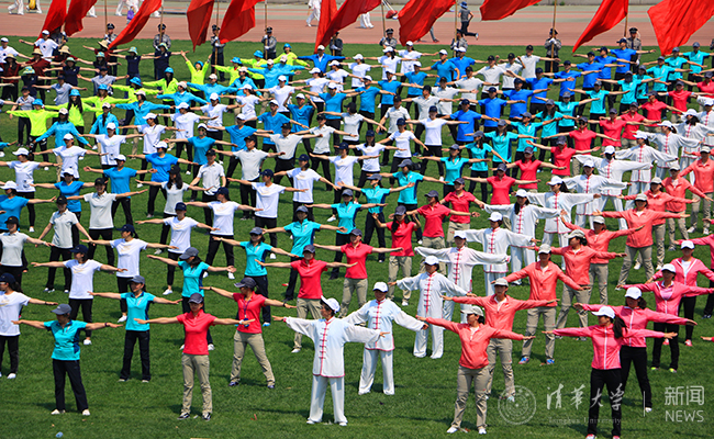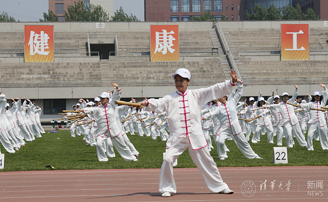 广播操之后,由心博在线登录入口工会太极拳协会组织进行团体十五式太极棒表演。十五式太极棒是太极拳协会于2016年创编的独特太极健身项目,融合了太极棒、太极剑、太极刀的基本动作,表现了清华人自强不息的和谐风貌。参与此次表演的有33个分工会的太极拳爱好者以及太极拳协会的会员,共计620人,伴随着优美的《红梅赞》,老师们向观众展现了刚毅与柔美并存的太极功夫,沉稳大气的太极招式赢得了场内观众的阵阵掌声。
