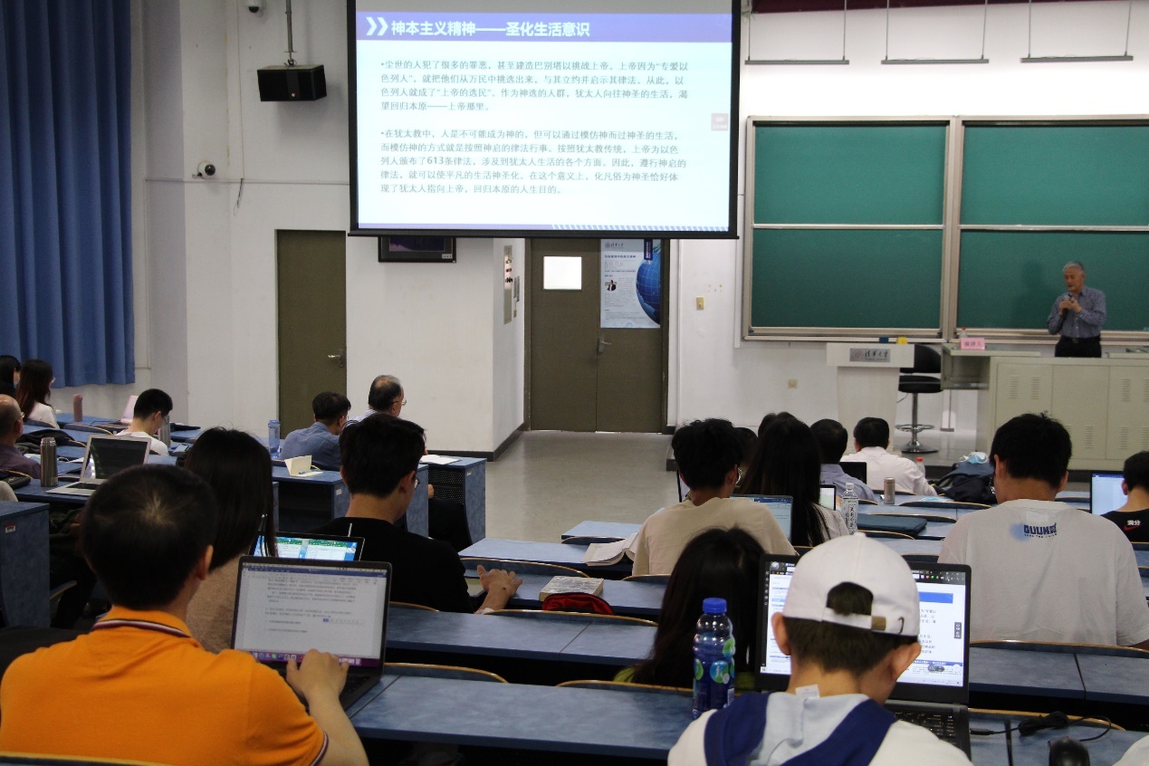 讲座伊始,傅有德表示,每个民族都享有人类群体的共性,但是每个民族同时也呈现出自己的民族个性或精神。犹太民族历史久远,命运多舛,历经磨难而延续至今,其中凝结着与众不同的民族精神。傅有德将犹太精神概括为五个方面,即宗教信仰层面的神本主义精神、伦理道德层面的崇尚德行精神、认知和行为方式层面的求异自立精神、教育方面的学而不厌精神、群体心理层面上的坚毅不屈精神。