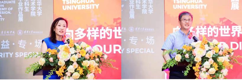 清华基金会秘书长袁桅、清华美院党委书记马赛介绍公益竞买活动