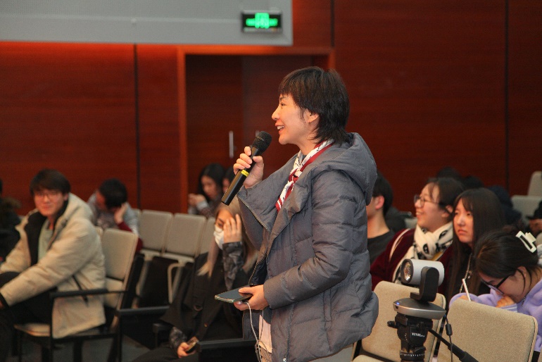 在个人分享环节,莲羊首先向师生讲述了岩彩画的制作工艺以及在中国悠久的发展历史。同时,她围绕“文化自信与传统艺术普及”深入介绍了岩彩画在自媒体时代的发展,以及与非遗、游戏、电影、汉服等领域的跨界合作。