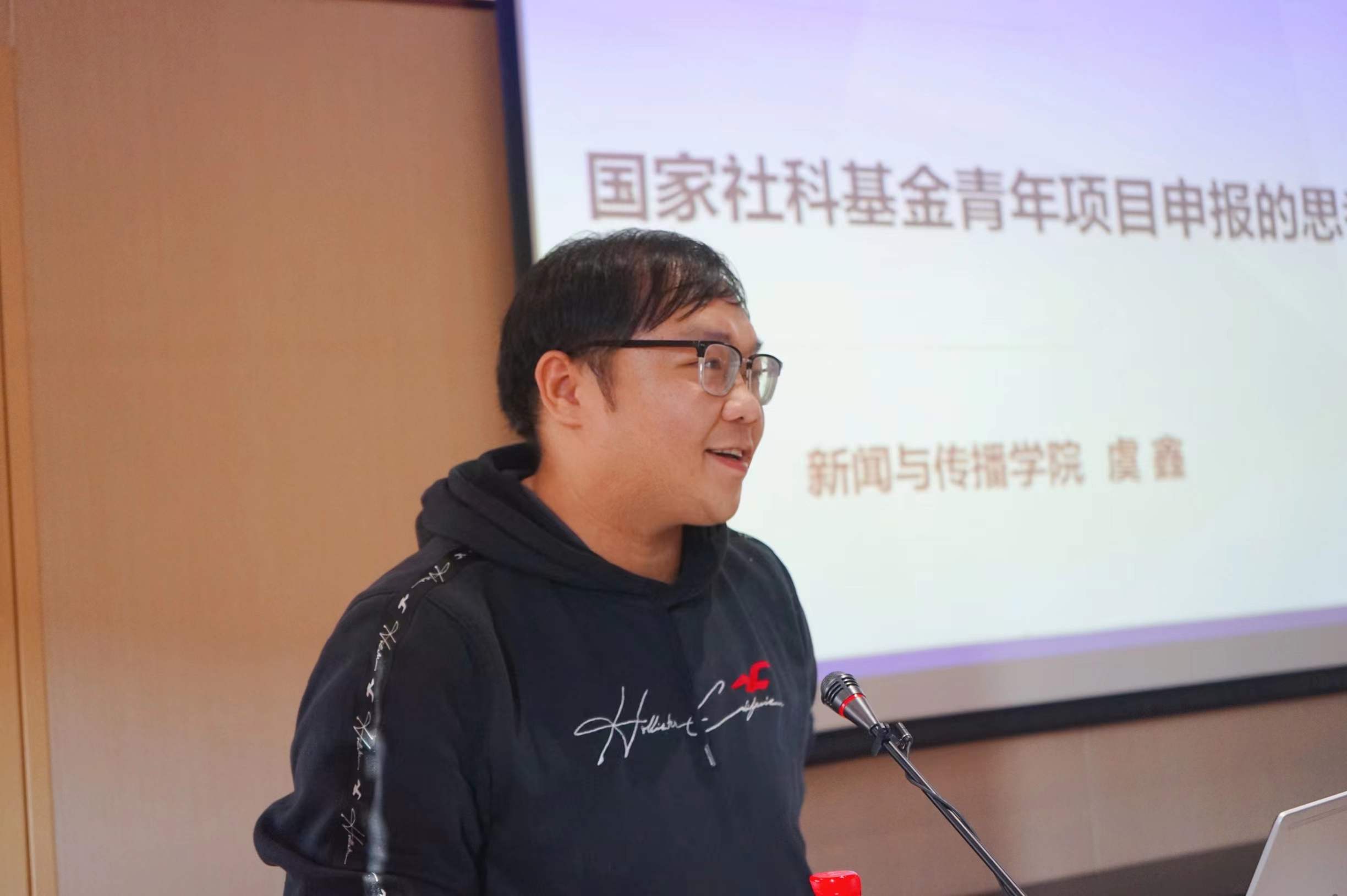 新闻与传播学院副教授、博士生导师虞鑫分享了个人在国家社科基金青年项目申报过程中的思考。虞鑫表示,好的选题是成功的一半,找到真正把握国家战略、洞悉学术前沿的研究问题是最为关键的一步。而在进行课题论证时,必须遵循完整清晰、突出重点的原则,必要时还可辅以相应图表来突出研究结构的合理性和逻辑性。