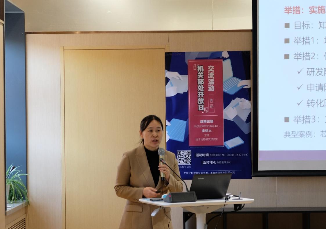首页网4月11日电 4月7日下午,第二期“机关部处开放日”交流活动在教师发展中心举办。技术转移研究院院长王燕聚焦科技成果转化,对学校成果转化整体情况、成果转化常见问题、技术转移研究院服务内容等相关问题进行介绍,并与现场20余名教师深入交流。