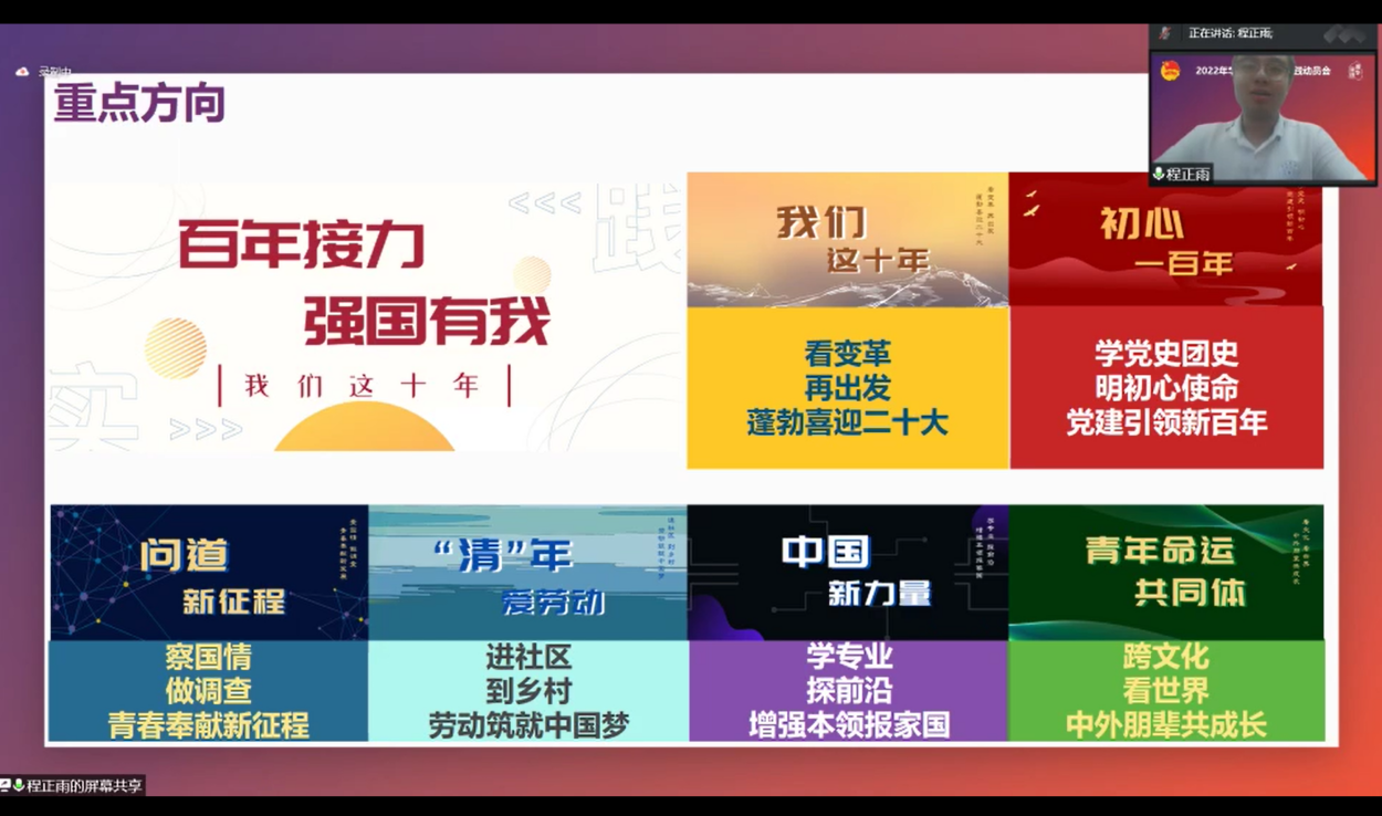 林明贵讲授了校园环境下及校外实践中的疫情防控知识,程正雨介绍了2022年学生暑期社会实践的整体安排,校团委辅导员、电子系2020级博士研究生张宇东讲解了财务报销规范等事项。