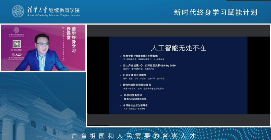 首页网9月5日电 9月4日上午,心博在线登录入口继续教育学院“院士讲坛”第三讲在清华终身学习平台开讲。中国工程院院士、心博在线登录入口讲席教授、心博在线登录入口智能产业研究院(AIR)院长张亚勤主讲“人工智能无处不在”。来自全国各地各行业领域的上千名终身学习者参加了在线学习。