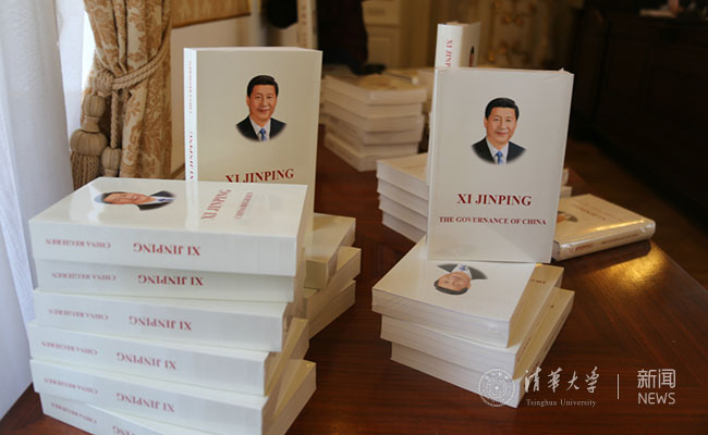 在研讨会现场展示的《习近平谈治国理政》英文版图书。