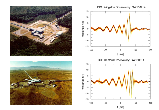 分别位于Livingston和Hanford的LIGO探测器以及它们分别探测到的引力波信号。两个探测器距离3000公里(相当于光速传播10毫秒)。这一引力波首先到达Livingston探测器,7毫秒之后到达Hanford探测器,这意味着引力波源位于南半球天区。另外,根据这一观测信号,LIGO科学家算出事件发生在13亿年前,两个黑洞分别为29和36倍太阳质量,在不到1秒的时间内将大概3个太阳质量的物质转化为了引力波,峰值功率输出大概相当于可见宇宙总功率的50倍。