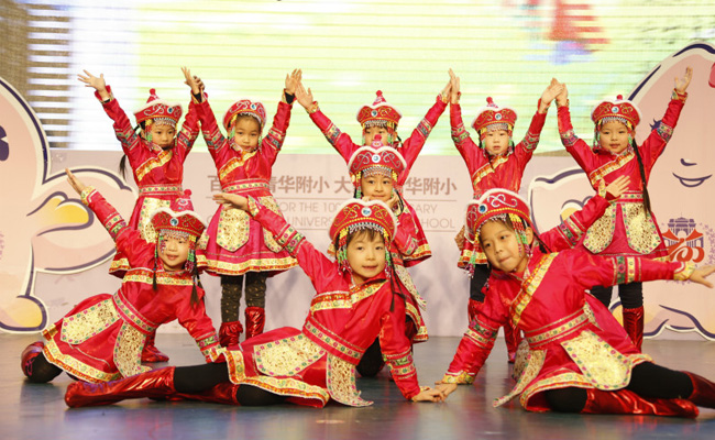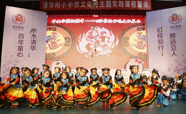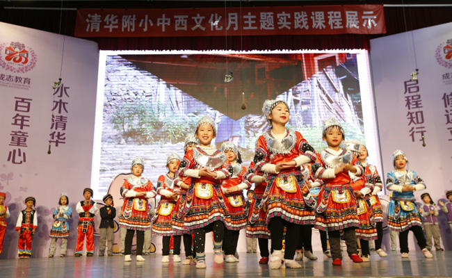 清华附小12月份的“中西文化主题月”充分利用校内外资源,以师生、家长、专家共同开发的课程手册为载体,以主题阅读、戏剧展演、艺术创作、家长课堂、社会实践等形式,让学生了解少数民族文化、亚洲各国文化和西方各国文化,促进学生初步形成文化理解、国际视野,进行跨文化交流,培养学生的天下情怀、审美雅趣。