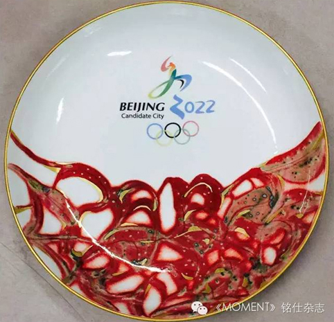 中国是以瓷命名的国家,用瓷器作为国礼彰显尊贵礼仪。釉里红是中国传统的釉下彩装饰品类,素以可遇而不可求、色彩斑斓变化万千著称,此作品的红色浓郁热烈,边缘产生如宣纸渲染般的红晕,此为烧成时窑内气氛独特造成,又经多次釉上烧制,实属珍贵难得。纹饰运用艺术化了的如植物新叶般环环相扣,充满勃勃生机,又似无数五环热情相拥,友爱和睦。图形两侧上扬,具展翼飞翔之态,合更高更强奥运之理念。盘沿口和部分画面用纯金点缀,显国礼之尊,也更具阳光灿烂的美感。空白的中心,置一北京申奥标志,极显端庄,也寓意对申办冬奥的全民向往。