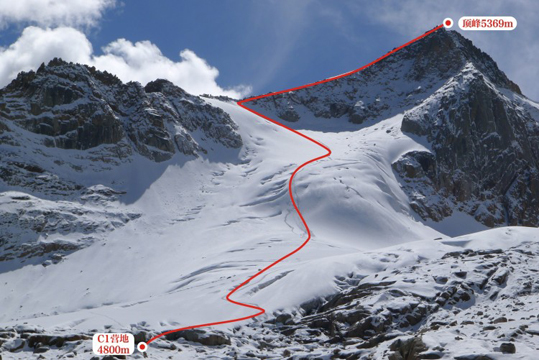 年保玉则主峰与预计登顶路线。