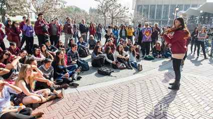 26日上午,代表团访问了斯坦福大学,艺术团同学在校园露天广场进行了小型音乐会表演,吸引很多斯坦福师生观看演出并与艺术团的同学们进行互动。