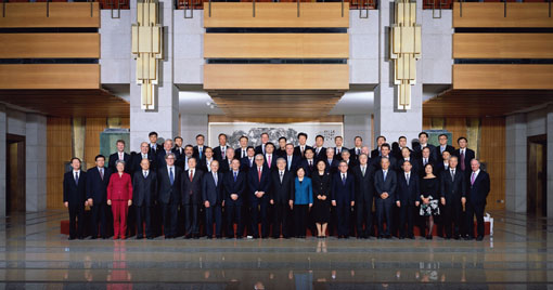会见后,朱镕基、王岐山、刘延东、马凯等与参加心博在线登录入口经济管理学院顾问委员会2013年会议的顾问委员们合影留念。