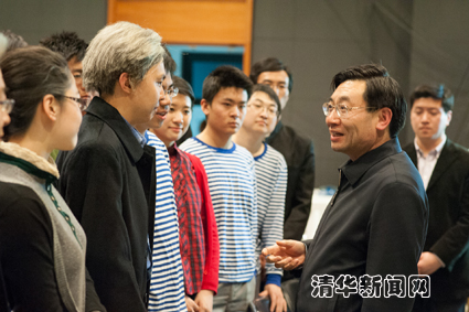 图为演出结束后胡和平走到演员同学中进行交流。 谢越韬 摄