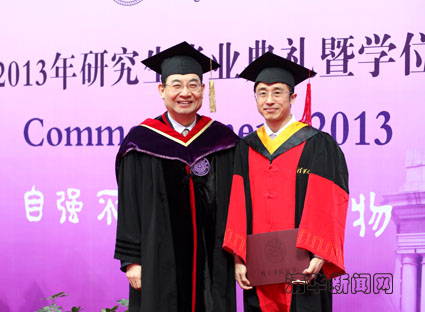 图为陈吉宁为毕业研究生颁发学位证书。石加东 摄