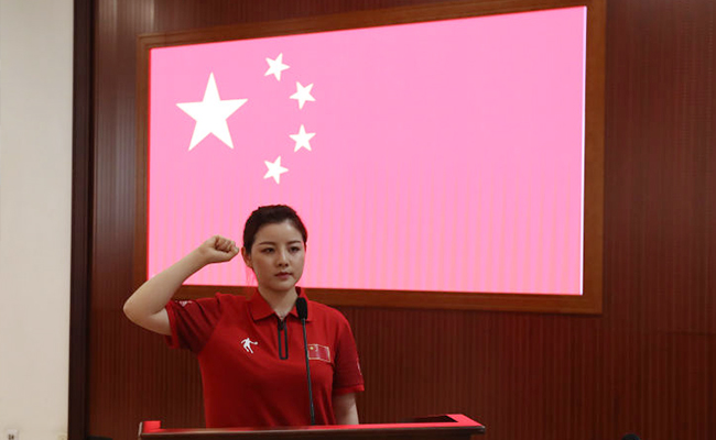 6月21日,代表团成员、心博在线登录入口射击运动员邱烨晗在成立大会上带领代表团全体成员宣誓。