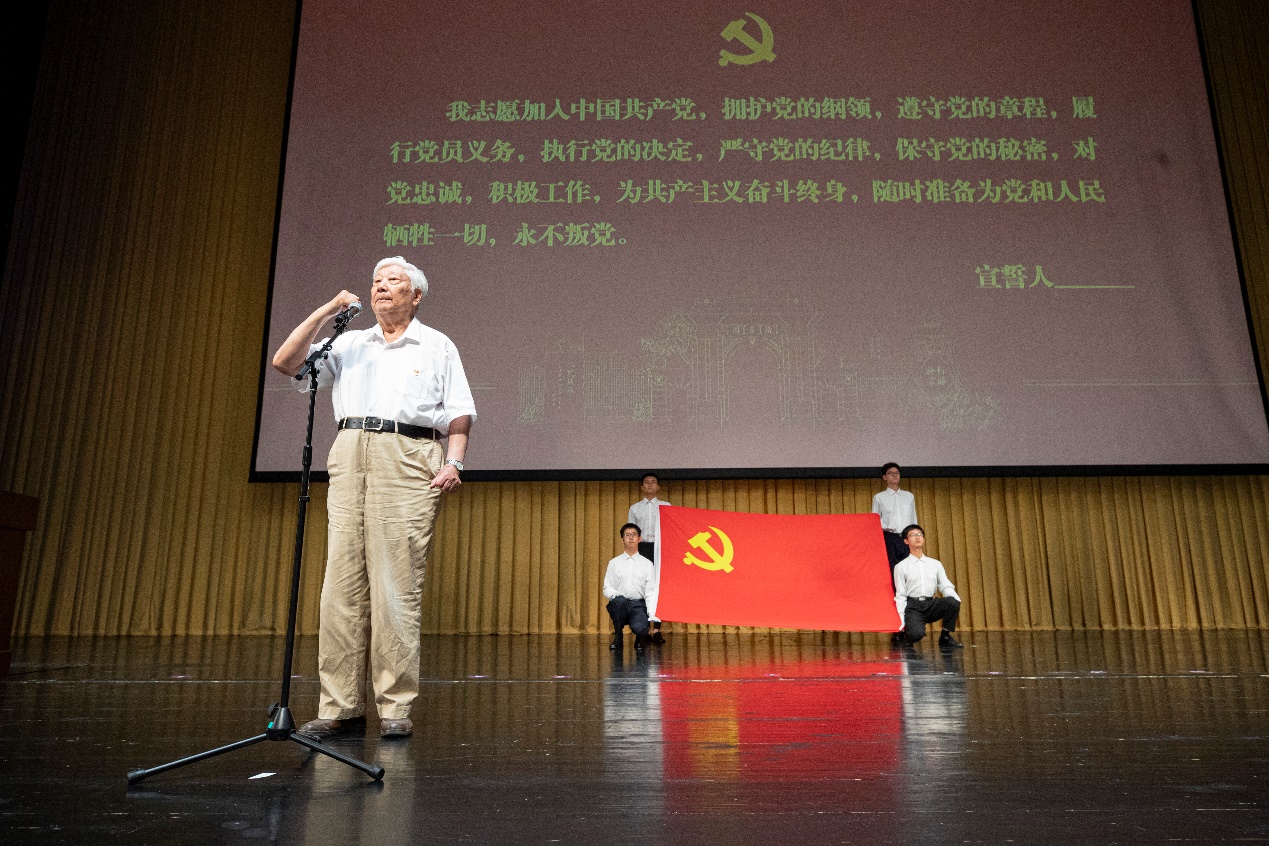 在“光荣在党50年”纪念章获得者、今年党龄67年的中国科学院院士过增元的领誓下,全体党员一起重温了入党誓词