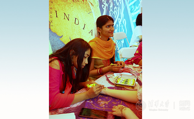 印度展棚前同学们好奇地学习手上彩绘