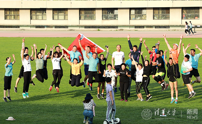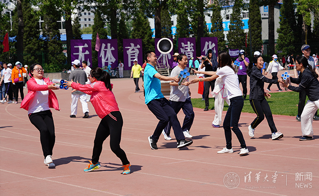 开幕后第一项比赛是“薪火相传”8人接力赛。这是一项深受欢迎的友谊赛,吸引了越来越多的关注和参与,今年共有39个分工会组队参加。每个队的参赛选手有各个年龄段的老中青三代教师,体现了清华教育事业和学科发展薪火相传的优良传统。比赛期间,各单位为自己的队员加油呐喊,运动场上很快进入了比赛状态。
