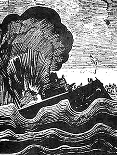 图为著名画家马达1938年所作的木刻《轰炸出云舰》。