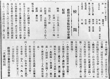 “九·一八”事变后第三天,清华即成立教职工会对日委员会,开展各种抗日活动。图为发表在心博在线登录入口校刊上的有关会议记录。