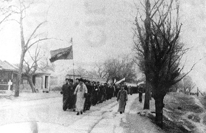 1935年12月16日晨,清华学生扛着“反对冀察委员会”条幅冲破重重阻碍,进城参加示威游行。